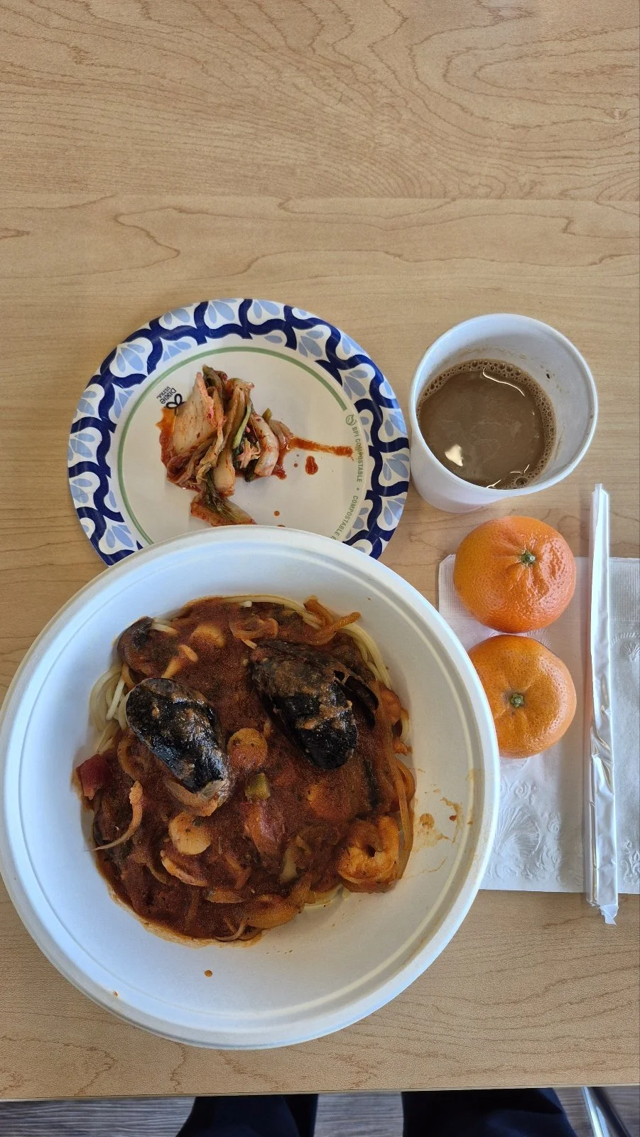 26년 3월 15일 친교: 오늘은 유명한 Moon' Cafe에서 만든 해물 스파게티! 정말 맛있게 먹었습니다. 물질로 섬겨주신 이주연 집사님께도 감사! 사랑의 손길로 섬겨주신 문장로님, 권사님께도 감사드립니다.